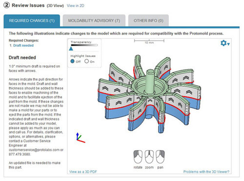 Uno degli strumenti più preziosi disponibili presso Protolabs è la nostra analisi gratuita di realizzabilità (DFM) fornita per ogni modello 3D caricato sul nostro sito. In poche ore, riceverete un preventivo che evidenzia sezioni dettagliate del modello che richiedono angoli di spoglia e suggerisce persino modifiche per migliorare l'angolo di spoglia in quelle sezioni. Questo servizio funge da buon controllo della qualità per evitare problemi di stampabilità futuri.