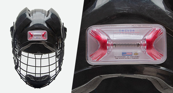 Tozuda’s solution is mechanical, using a compressed spring and ball bearings that keep dye tucked away in reservoirs on either side of the device. When an impact of sufficient force happens, the spring and bearings dislodge and dye spills into a chamber, causing the device to turn red. When the color changes, it indicates the possibility that a concussion has occurred and the user should be evaluated for potential traumatic brain injury (TBI). Only a licensed medical professional can diagnose a concussion.