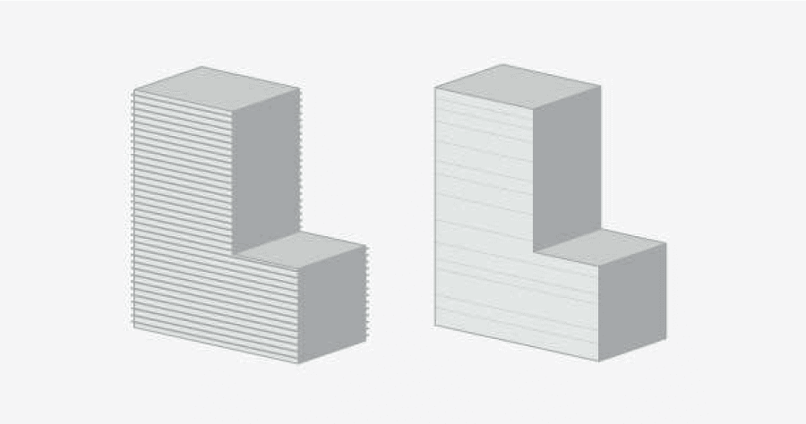 Auf einer vertikalen oder horizontalen Fläche produziert das direkte Metall-Lasersintern (DMLS) Teile, deren Rauheit in etwa der beim Sandguss entspricht. Bei allen anderen Oberflächen ist ein gewisser Stufeneffekt sichtbar. Wenn Sie für Ihr Design eine glatte Oberfläche benötigen, muss dieser Stufeneffekt gestrahlt, geschliffen oder maschinell bearbeitet (siehe Abbildung rechts) werden.