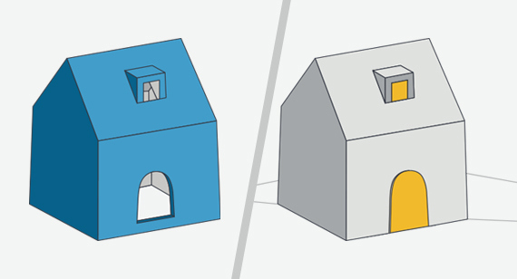 To take a closer look at shut-offs—a design element that allows engineers to solve difficult tooling and design issues—let's consider the injection moulding of a box. The box looks like an A-frame house with four vertical walls and a roof. On one of the vertical walls there is a cut out that would resemble a door and on the roof there is a dormer with a window. See Figure 1a.