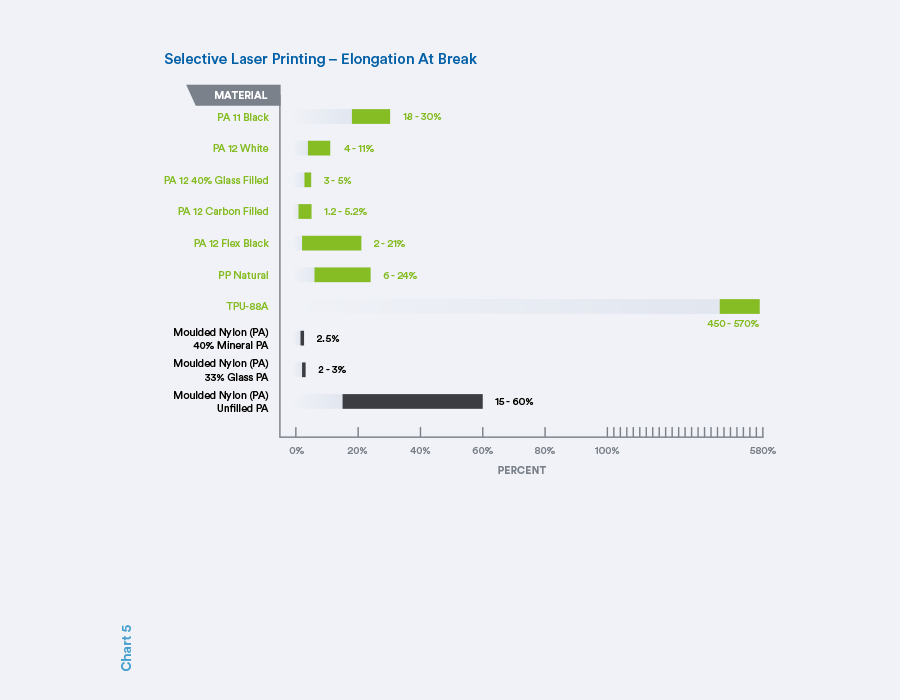 Generally, SLS PAs, when compared with the average values of their injection moulded counterparts, have similar HDT values but lower values for the mechanical properties. In a few instances, SLS PAs report properties that document the degree of anisotropism. For a visual comparison of SLS mineral properties, see Chart 4 for heat deflection, Chart 5 for elongation at break and Chart 6 for tensile strength.