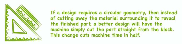 If a design requires a circular geometry, then instead of cutting away the material surrounding it to reveal the finished part, a better design will have the machine simply cut the part straight from the block. This change cuts machine time in half.