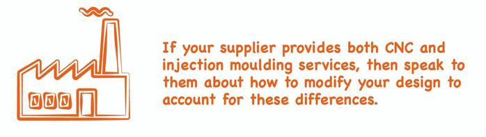 If your supplier provides both CNC and injection moulding services, then speak to them about how to modify your design to account for these differences. Your other option is to prototype your parts using the final production process – there are cost effective ways of doing this with injection moulding but that’s the subject of a future video.
