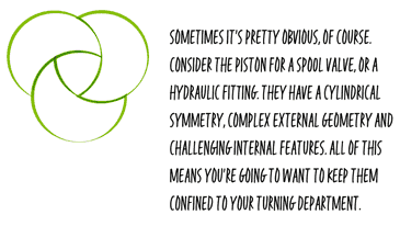 Sometimes it’s pretty obvious, of course. Consider the piston for a spool valve, or a hydraulic fitting. They have a cylindrical symmetry, complex external geometry and challenging internal features. All of this means you’re going to want to keep them confined to your turning department.