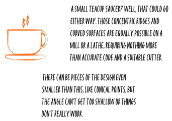 A regular old pint glass, for example, with its smooth, regular shape and length several times greater than the outside diameter is a nice and easy to produce on a lathe. A coffee cup with a jutting handle and finger-ready hole, however, is impossible to turn. That’s a job for the milling machine.
