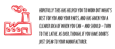 Hopefully this has helped you to work out what’s best for you and your parts, and has given you a clearer idea of when you can – and should – turn to the lathe. As ever, though, if you have doubts just speak to your manufacturer.