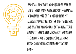 And if all else fails, you should be able to make things work using a pickout – that’s a detachable part of the mould that we manually insert before the injection begins, and that we need to pull out again after it finishes. There’s a bit more cost than other techniques, but it can overcome almost every shape and positioning restriction going.