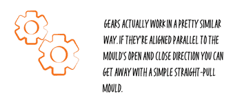 Gears actually work in a pretty similar way. If they’re aligned parallel to the mould’s open and close direction you can get away with a simple straight-pull mould. Just bear in mind that when the gears get deep, the faces on the gear teeth may need to be drafted to allow the gear to eject nice and cleanly from the mould.