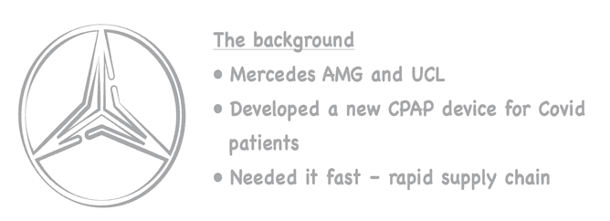 But this week I’m going to do something a bit different. You’ve heard all about the theory, but what about the practice? I’m going to show you how we helped Mercedes-AMG use rapid prototyping and on demand manufacturing to produce urgent CPAP devices for Covid-19 hospital patients to help meet the tightest of critical deadlines.