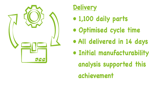 When production started, a time and motion study identified how to optimise the cycle time so that we could produce all the parts needed in just 72 hours and deliver them in five intervals to support the lineside production at Mercedes.
