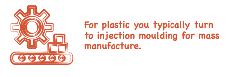 For plastic you typically turn to injection moulding for mass manufacture. The problem for smaller quantities is that steel moulds are expensive and you have to wait 10 to 12 weeks for them to be ready. Sure, you could call off ten thousand but if that is your only order then the price per part will be expensive.