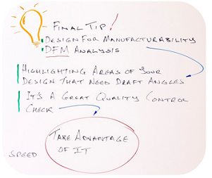 The final tip I have today is one of the easiest to take advantage of, because it’s normally free. Your supplier should offer a free design for manufacturability (DFM) analysis on 3D CAD models. It should give you a whole heap of information, which includes highlighting areas of your design that need draft angles.