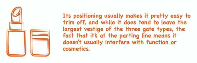 These consist of a block that’s milled into the parting line on one of the part’s thicker walls, allowing the liquid plastic to be pushed into the mould. Its positioning usually makes it pretty easy to trim off, and while it does tend to leave the largest vestige of the three gate types, the fact that it’s at the parting line means it doesn’t usually interfere with function or cosmetics.