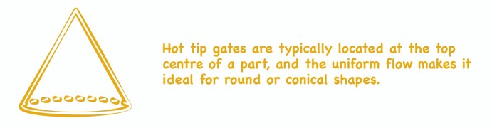 Hot tip gates are typically located at the top centre of a part, and the uniform flow makes it ideal for round or conical shapes. The gate leaves a small raised nub on the surface of the part, but adding a dimple to your design may help shift the nub below the surface of the part, which might allow something like a decal to be applied over it with little or no need for trimming beforehand.