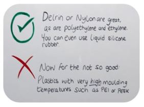 Now for the not so good: and I’m talking about those plastics with very high moulding temperatures such as PEI or PEEK. This is because inserts are often hand loaded and if, like us, your supplier has a quick turnaround process using non-cooled tools to reduce part cost and speed up processing, then you really don’t want to be placing an insert into a mould that’s been heated to several hundred degrees. It’s like reaching into a hot oven to grab a freshly baked biscuit – you’ll burn your fingers!