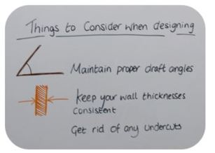 When it comes to designing the part, the good news is that you need to think about the same things as for any other injection moulded part. Maintain proper draft angles, keep your wall thicknesses consistent, get rid of any undercuts, in fact all the usual stuff that we’ve talked about in our previous Insight videos.