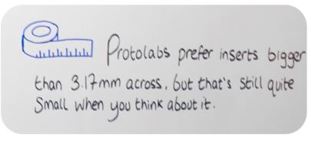As I have said, most suppliers will probably hand load the insert into the mould. Those moulds are normally quite warm, so the operative will be wearing gloves. You know what it’s like trying to handle small fiddly things while wearing gloves, well it means that they may ask for a minimum size of insert. At Protolabs for example, we prefer inserts bigger than 3.17mm across, but that’s still quite small when you think about it.