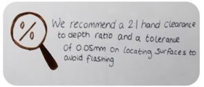 Also, no insert should be too deep inside the mould, we recommend a 2:1 hand clearance to depth ratio.