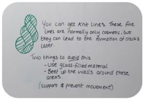 And finally, when molten plastic flows around an object, such as your insert, and then rejoins it on the other side, you can get knit lines. These fine lines are normally only cosmetic, but they can lead to the formation of cracks later. There are two things you can do to avoid this; the first is to use a glass-filled material and the second is to beef up the walls around these areas. Slightly thicker walls or ribs in the area around the insert are a good idea to support it and prevent movement.
