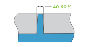 A continuación, estudiaremos el diseño de las nervaduras de apoyo. Lo ideal al diseñar nervaduras es utilizar una proporción de grosor nervadura / pared del 40 al 60 por ciento del grosor de las superficies adyacentes. El cuerpo principal de la pieza ha de diseñarse lo suficientemente grueso para que las nervaduras adyacentes extrudidas de él tengan aproximadamente la mitad de su grosor. Esto ayuda a evitar secciones gruesas que puedan enfriar a diferente velocidad que las secciones finas. También ayuda a reducir el hundimiento y tensiones que pueden crear alabeo en su pieza.