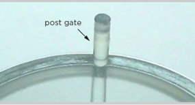 Una entrada guía es un ejemplo extremo de un soporte de extractor saliente (figura 2). En los casos en que no se pueda utilizar una entrada lateral, la resina se inyecta a través de una extensión de un canal del pivote eyector. Cuando la pieza se ha enfriado, el pivote eyector empuja contra el poste resultante y, en el proceso, corta el canal de colada. Normalmente, el poste se extrae de la pieza terminada en una operación secundaria.
