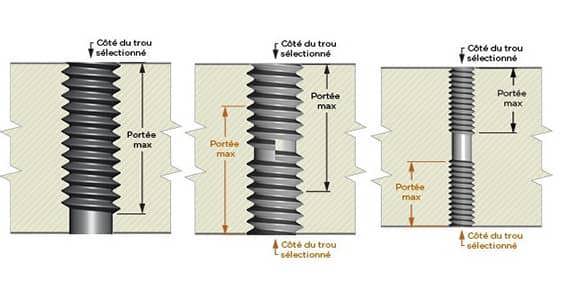- Dans le cas d'un long trou débouchant dont la longueur dépasse la portée maximum, sélectionnez le trou à partir du côté où la vis devrait commencer, comme illustré dans l'image 1. Si votre vis doit traverser entièrement la pièce, vous devrez également faire passer un taraud dans le trou (lors d'un processus secondaire) afin de réaliser l'opération.
