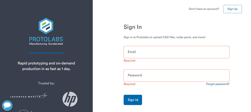 2. Create a new account, or sign in to your existing Protolabs account. After first sign in, we’ll remember your info for future visits.