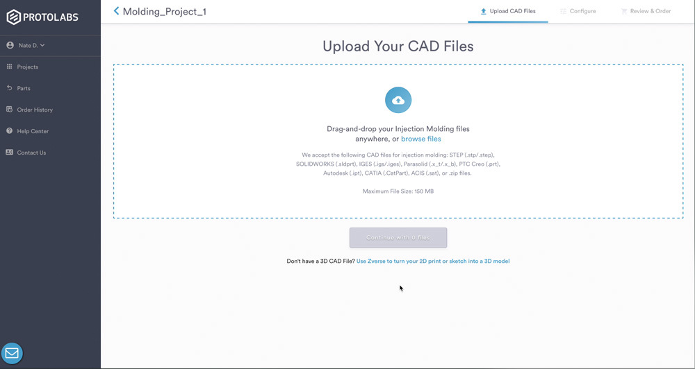1. Once you’ve uploaded your CAD file/s to your project, hit Continue to start configuring your part