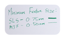 Se desiderate una risoluzione più fine, la MJF produce elementi la cui dimensione minima è di 0,5 mm, più fine rispetto agli 0,75 mm ottenuti con la SLS. Ma... C’è sempre un ‘ma...’, giusto? La qualità dei pezzi realizzati con la MJF è più variabile, in termini di dettaglio fine, rispetto a quelli prodotti con la SLS.