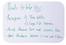 Pareti sottili o superfici piatte di grandi dimensioni devono essere rinforzate con nervature o tasselli mentre i fori dovrebbero essere circondati da borchie in rilievo.