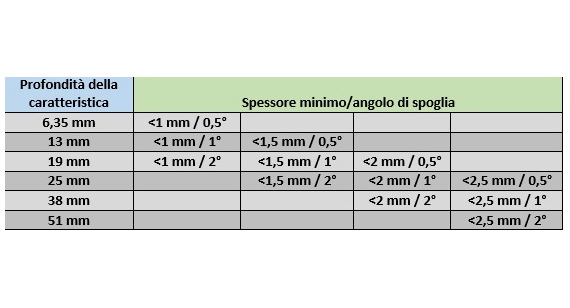 Nella progettazione di un pezzo, applicate il maggior angolo di spoglia possibile; la regola generale è di 1 grado ogni 25 mm di profondità della cavità, ma tale angolo di spoglia può variare tenendo in considerazione i fattori sopra citati. Provate a seguire queste linee guida generali: