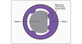 Nello stampo, le nervature rappresentano una superficie piuttosto limitata perciò, pur non essendo angolate, non creano particolare resistenza al momento dell'espulsione, limitando così il rischio di danni allo stampo. Le zone appuntite in cui le nervature incontrano l'albero (o altre parti combacianti) consentono alle nervature di deformarsi durante l'inserimento a pressione, garantendo un accoppiamento saldo senza sottoporre il pezzo a sollecitazioni eccessive. Purtroppo, l'elemento appuntito a forma di V non può essere fresato direttamente nello stampo e richiede perciò il ricorso all'elettroerosione o ad altri procedimenti aggiuntivi durante la realizzazione dello stampo.