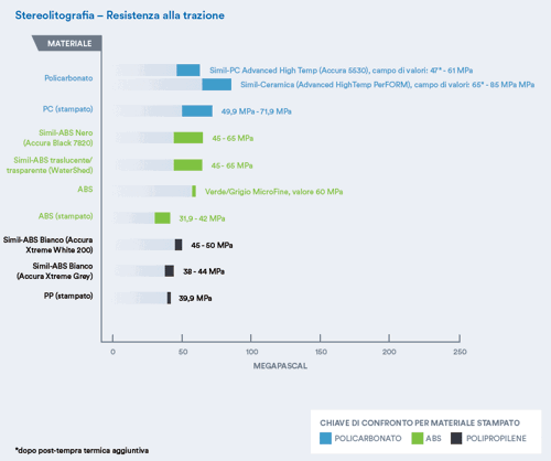 Generalmente, una o due proprietà del materiale distinguono un materiale additivo da tutti gli altri. Per esempio, se si cerca la resistenza media alla trazione della poliammide (PA)11, un fotopolimero da stereolitografia potrebbe essere un'opzione migliore di un PA da sinterizzazione laser selettiva. Al contrario, se è necessaria la temperatura di inflessione per calore (HDT) di un ABS, l'opzione migliore sarebbe un nylon sinterizzato.