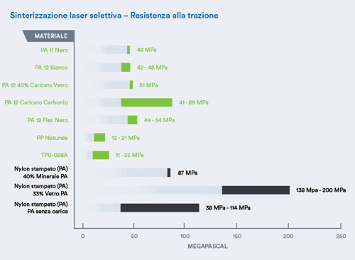 In generale, le PA SLS, se confrontate con i valori medi delle loro controparti stampate a iniezione, hanno valori HDT simili ma valori inferiori per le proprietà meccaniche. In pochi casi, le PA SLS riportano proprietà che documentano il grado di anisotropismo. Per un confronto visivo delle proprietà dei materiali SLS, vedi Grafico 4 per l'inflessione del calore, Grafico 5 per l'allungamento a rottura e Grafico 6 per la resistenza alla trazione.