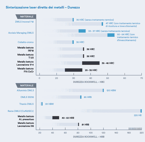 certa varianza di proprietà quando misurata lungo diversi assi. Per un confronto visivo delle proprietà dei materiali DMLS, vedere Grafico 1 per la resistenza alla trazione, Grafico 2 per l'allungamento e Grafico 3 per la durezza.