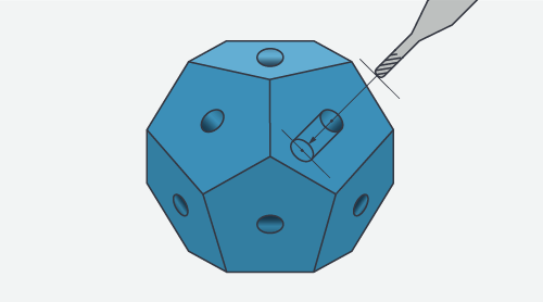 Oltra alla fresatura a 3 assi, Protolabs si avvale di un processo di fresatura indicizzata a 5 assi per la lavorazione dei pezzi. Nella fresatura indicizzata a 5 assi (denominata anche fresatura 3+2), due assi rimangono immobili mentre il pezzo è sottoposto a lavorazione. Questa tecnica consente la realizzazione di geometrie più complesse e dettagli non ortogonali, quali fori fuori asse.