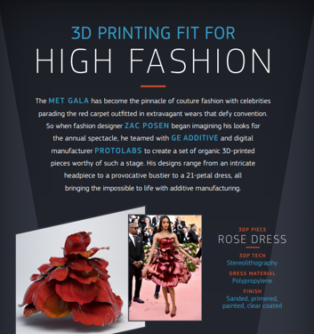 The garments and accessories, worn at the annual fundraising event for the Metropolitan Museum of Art in New York, were the result of an uncommon collaboration by noted designer Zac Posen, GE Additive, and Protolabs. The fashions were worn by British supermodel Jourdan Dunn, and actresses Nina Dobrev, Katie Holmes, Julia Garner, and Deepika Padukone.