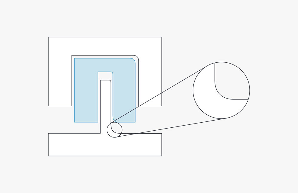 Any part that requires square corners will cost much more, as the only way to produce them is to burn them out with electro-discharge machining (EDM) or to cut slowly with extremely small tools.