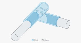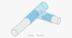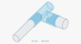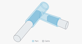 All sorts of reasons exist to create channels within a plastic part. Channels, tunnels, and holes can convey liquids, gases or, in some cases, even solids; we often see them in parts for medical devices. Channels are formed in injection-molded plastic parts with cores or pins projecting from a mold half or cam. At Protolabs these pins can be milled out of the mold block or a more robust steel pin can be inserted after milling. An interesting challenge arises when two channels meet within the body of a part. The challenge is forming a reliable shutoff where the two pins meet. The seemingly logical way to do that would be as shown in Figure 1.
