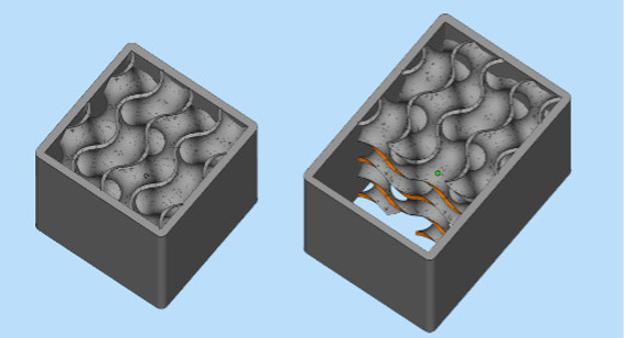Ob ein Bauvorgang scheitert oder erfolgreich ist, hängt wie bei anderen Gitterarten auch davon ab, wie das Gyroidgitter endet. Im Idealfall ist ein Gyroidgitter umgeben von festen Wänden, so dass es mit zunehmender Ausweitung nicht in einem Element endet, dass eine Stützstruktur erfordert. Das Gitter des Bauteils unten links ist auf allen vier Seiten von Wänden umgeben. Diese Wände stützen das Gitter. Das Gitter des zweiten Bauteils endet, ohne von einer festen Wand gestützt zu werden. Das Gitter des zweiten Bauteils endet in einem flachen Winkel. Daher benötigen die Gitterränder Stützstrukturen, die sich möglicherweise nicht entfernen lassen.