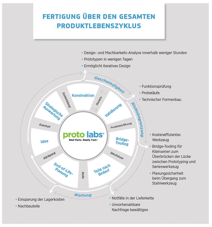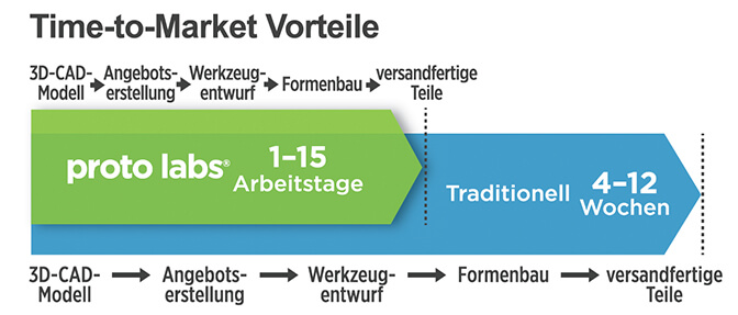 Wenn das Produktdesign anhand von Prototypen bewertet werden soll, die mit den bei der Produktion angewendeten Methoden hergestellt wurden, kann auf Anbieter zurückgegriffen werden, die sich auf die Schnellfertigung mit konventionellen Methoden, wie CNC-Bearbeitung und Spritzguss, spezialisiert haben. Obwohl der Fertigungsprozess unverändert ist, führt die Prozessoptimierung dank Automatisierung zu deutlich kürzeren Durchlaufzeiten. So kann beispielsweise eine Bestellung von 500 Spritzguss-Prototypen, deren Auslieferung Monate dauern kann, mit den Schnellspritzgussdiensten von Protolabs innerhalb von 7 bis 10 Tagen bereitgestellt werden.