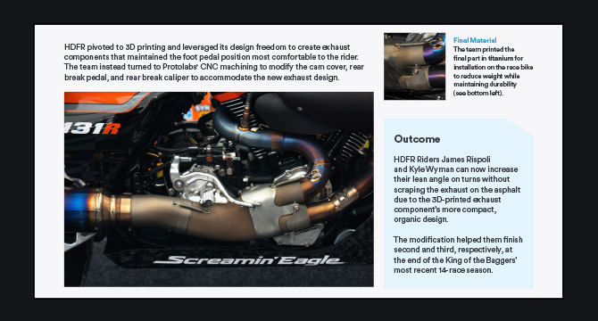 To that end, HDFR engineers constantly evaluate how they can modify parts on the bike to add extra lean angle, which can help maintain performance and comfort for the rider. The exhaust components on the right side of the motorcycle offered the best potential for improving lean angle, so the team turned to the design freedom of metal 3D printing at Protolabs to see what is possible.