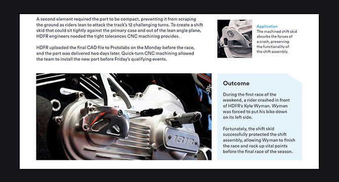 With a rainy forecast for the final race of the season and a top spot in the standings on the line, HDFR engineers designed a shift skid that Protolabs machined and delivered in two days. The part built to protect the shift assembly is intended to take the brunt of any damage on the left side. In the end, the part went on to play a critical role, not only in the final race but also moving forward, allowing riders to continue competing for precious points throughout the season.