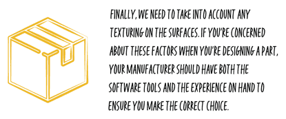 If you’re concerned about these factors when you’re designing a part, your manufacturer should have both the software tools and the experience on hand to ensure you make the correct choice.