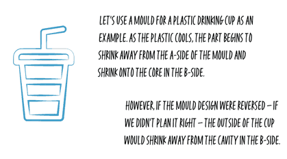Let's use a mould for a plastic drinking cup as an example. To ensure that the part stays in the mould half with the ejector system, we’d like to design the mould so that the outside of the cup is formed in the cavity and the inside would be formed by the core. As the plastic cools, the part begins to shrink away from the A-side of the mould and shrink onto the core in the B-side.