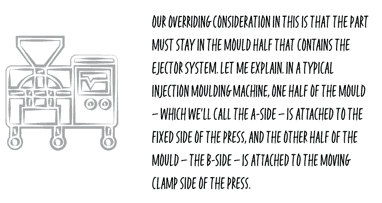Let me explain. In a typical injection moulding machine, one half of the mould – which we’ll call the A-side – is attached to the fixed side of the press, and the other half of the mould – the B-side – is attached to the moving clamp side of the press.