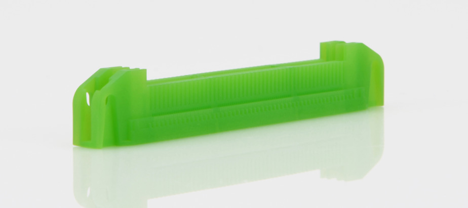 MicroFine™ is an SLA material only available through Protolabs. The material enables us to achieve features as small as 0.07 mm. In terms of its mechanical properties, the material is fairly durable, rigid, and most similar to an ABS plastic. Smaller features built in MicroFine are best dialed in when parts are around or less than 25 mm x 25 mm x 25 mm.