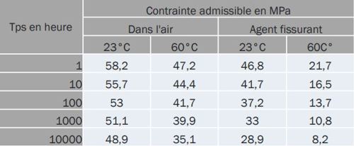 Si on se met au point de départ dans la case en haut à gauche, à 23 degrés, au bout d’une heure on est à 58 MPa de contraintes admissibles et on peut voir que cette valeur va nettement diminuer jusqu'en bas à droite à 60 degrés en présence de l'agent après de dix mille heures de fonctionnement. On voit bien à quel point la présence d'agents peut encore plus accentuer l'impact de la température sur la tenue mécanique d’une matière.