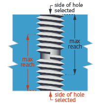 Comprendre la profondeur du filet : Tous nos filetages sont réalisés par CNC à l’aide d’une fraise à fileter et calibrés manuellement lors de l’inspection finale. Le fraisage de filets est plus fiable que le taraudage manuel, mais pour obtenir les meilleurs résultats, la profondeur du filetage est limitée à environ 2,5 fois son diamètre (voir la profondeur maximale dans le tableau ci-dessous). Ne vous inquiétez pas si votre trou est plus long ou plus court, voici comment notre logiciel va concevoir votre filetage : |