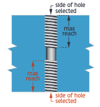 Example 1:Voici une vue en coupe d'un trou traversant fileté d'un côté. Dans ce cas, la profondeur du trou dépasse la portée de l'outil. Il en résulte une section non filetée opposée au côté sélectionné. |